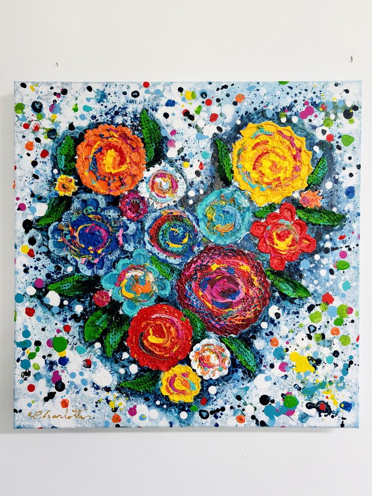 Ett färgglatt blomsterhjärta som sprider vibrerande kärlek omkring sig! Det finns så mycket elände på jorden så att omge sig med kärlek och glädje är ett måste! LOVE! Skulpterad av återvunnet hantverk på spänd duk.